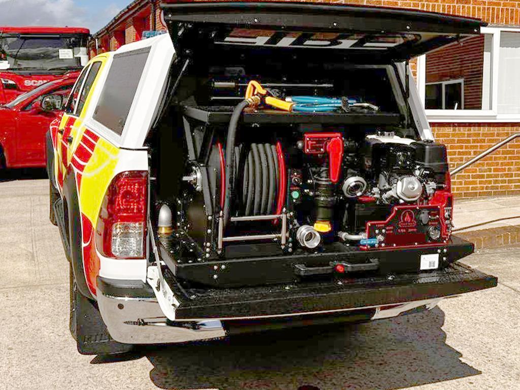 Fitted with an integrated 575L water tank and misting system capable of putting out a car fire with 40 Litres of water only.